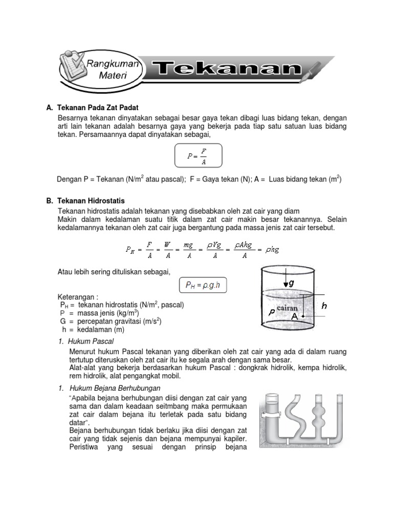 Soal soal tekanan kelas 8 pdf. Contoh soal tekanan hidrostatis dan pembahasan Nomor 1 Seorang anak menyelam di kedalaman 10 m dibawah permukaan air. Tekanan secara umum dapat diartikan sebagai besarnya gaya per satuan luas bidang.