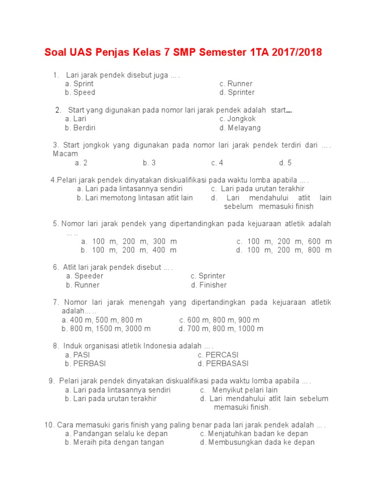 Soal dan Kunci Jawaban Penjas Kelas 7 SMP Semester 2 TA 20152016 1. Soal penjas orkes kelas 10 kurikulum 2013 berikut berisikan materi tentang atletik jalan cepat lari jarak pendek dan tolak peluru. Pada lomba lari jarak pendek akan diulang a.